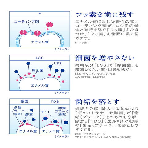 「予防歯科」の3つのポイントを1本でトータルに実践できる薬用ハミガキ◆高濃度フッ素1450ppm配合「高密着フッ素処方」で、エナメル質の修復を促進しムシ歯の発生と進行を防ぐ。◆歯垢を分解・除去する「酵素(デキストラナーゼ)」、さらに歯垢を落としやすくする「TDS(テトラデセンスルホン酸Na)」配合◆「LSS(ラウロイルサルコシンNa)」が原因菌を殺菌しムシ歯・口臭を予防◇「クールミント」の香味