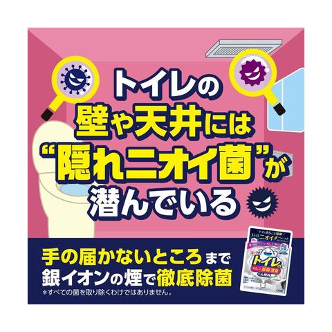 銀イオンの煙がすみずみにいきわたり、壁や天井、タンク裏など掃除がゆきとどかない場所やホコリに潜むニオイ菌まで徹底除菌!