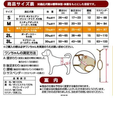 適応サイズ:腰まわり/40~60cm、後足まわり/25~42cm、腰幅/13cm、サスペンダー/45~87cm、体重/~15kg