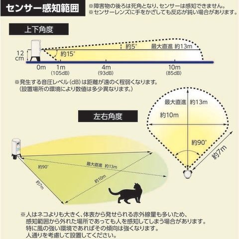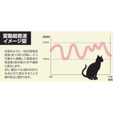 商品説明●赤外線センサーで猫の動きをキャッチし、その動きに合わせて変動する不快な超音波を放射することにより感知エリアから遠ざけます。●動物愛護の観点から傷つけず1~2週間かけて学習させ、猫の糞害などを防ぎます。●波長の変化で慣れを防止します。●繰り返し使える充電式のため、乾電池購入の必要がありません。●購入後1年以内であれば無償修理可能。●使用目安:充電1回あたり約1500回作動●有効面積([[M2]]):100●幅(mm):123●奥行(mm):111●高さ(mm):230●電源(V):7.4●消費電力(W):0.37●本体寸法(mm)奥行:111●本体寸法(mm)高さ:230●本体寸法(mm)幅:123●充電式 質量555g