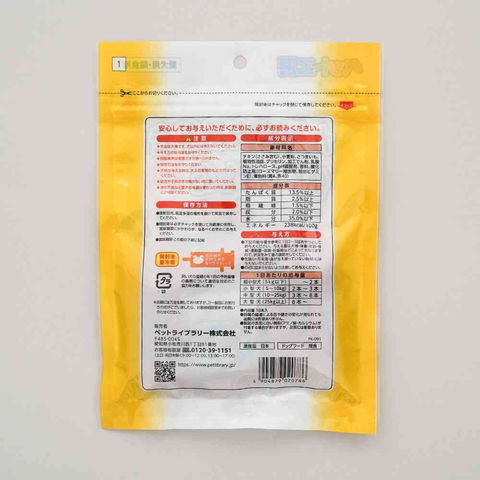 チキン(ささみ含む)、小麦粉、さつまいも、植物性油脂、グリセリン、加工でん粉、乳酸Na、トレハロース、pH調整剤、香料、酸化防止剤(ローズマリー抽出物、抽出ビタミンE)、着色料(黄4、赤40)