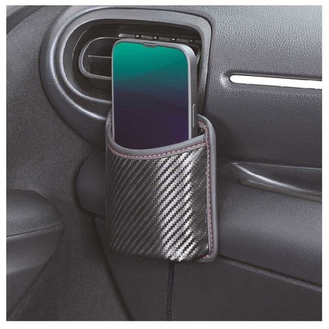 ●スポーティーな印象を与えるカーボン調生地を使用した収納ポケットです。