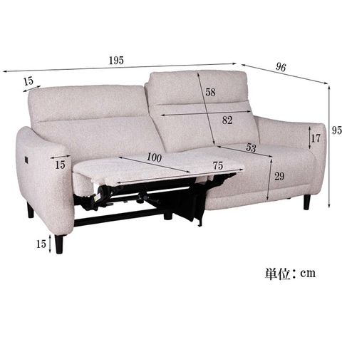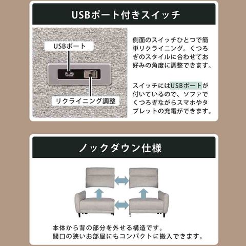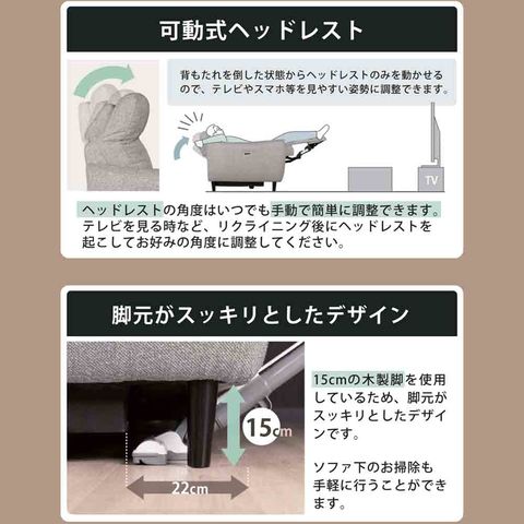 商品説明リクライニング可動域128°と広く、寛げる角度を細かく調整できる電動ソファー、ゼログラビティメカニズム採用。