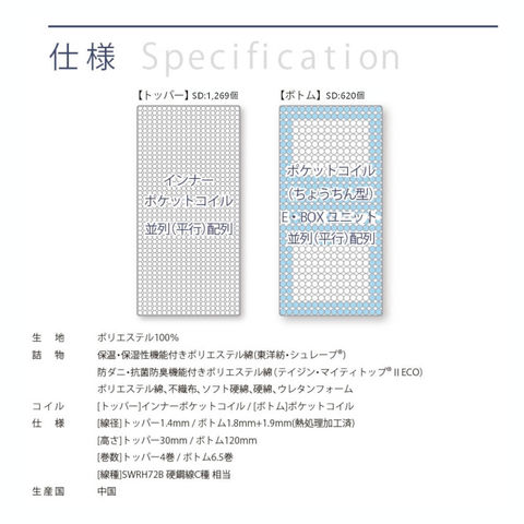 商品説明圧縮マットレスのトッパー付きモデル。ふんわりとした寝心地とE-BOX構造により腰部を支え,快適な寝心地を実現。