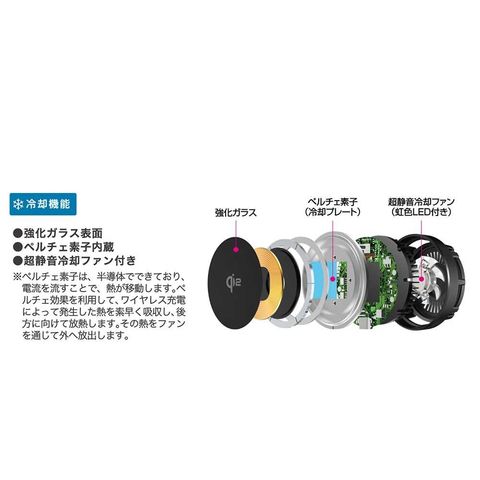 (充電器表面に強化ガラス採用、ペルチェ素子内蔵、超静音冷却ファン付き。)