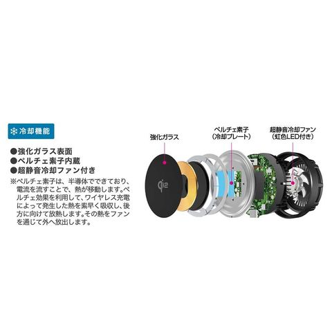(充電器表面に強化ガラス採用、ペルチェ素子内蔵、超静音冷却ファン付き。)
