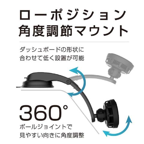 運転中の視界を妨げにくい低位置へ設置。上下角度調節も可能。
