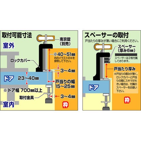 商品説明●建物にキズを付けずに、南京錠で扉を施錠できます。●内開きドア専用です。●取付け金具は丈夫なステンレス製で、「ハの字」の設計で強度がUPしています。●※南京錠は別売です。●本体ロックカバー幅×奥行×高さ(mm):55×61×64●取付金具幅×奥行×高さ(mm):55×143×40 質量269g