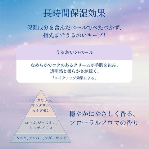 光拡散によるメイクアップ効果(ハンドビューティー効果)で、つけた瞬間からくすみをカバーし明るい手肌に仕上げ、保湿成分を含んだベールでコートするから、指先までうるおいが続く。
