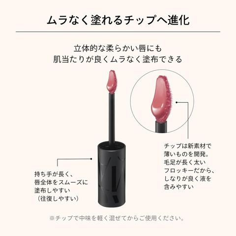 ●チップで中味を軽く混ぜてからご使用ください。 ●唇の中央にのせてから全体に塗り広げてください。