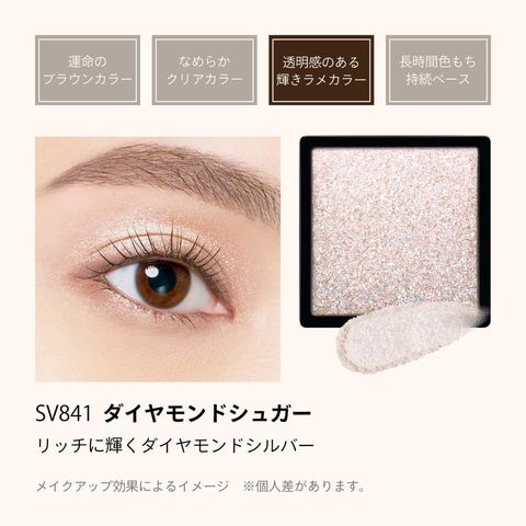 まぶたの中央や涙袋に重ねて、目もとを華やかに彩る きらめきのアクセント。透明感のある輝きラメカラー。