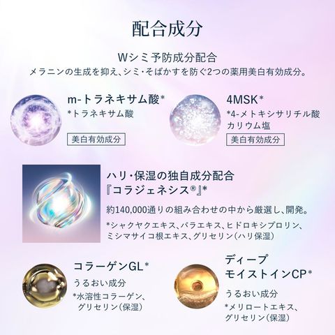 シミを防ぐ2つの美白有効成分と、ゆるぎないハリのための独自成分コラジェネシス(R)※※※配合。