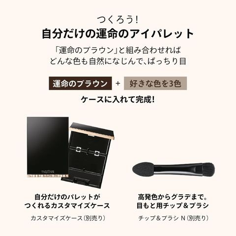 <カスタマイズケースへのセット方法> 本品の透明ケース内の中皿を1色ずつそっと取り外し、セットしてください。その際、中味を削らないようにご注意ください。 <おすすめのご使用法> ●指先またはお手持ちのチップにとってご使用ください。 (1)右上の色:アイホール全体に広げます。 (2)左下の色:広くぼかしたり、目尻にポイントでいれて、ニュアンスを演出します。 (3)右下の色:運命のブラウンカラーをまぶたの際に沿ってのせて、ぼかします。 (4)左上の色:アイホール中心、下まぶた、目頭などにのせて輝きをプラスします。