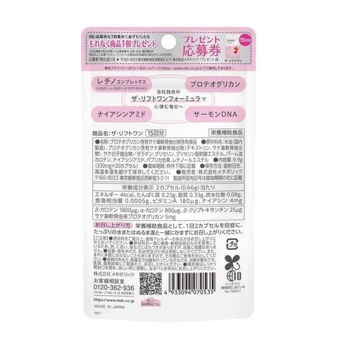 3つのプロビタミンAカロテノイドを配合した「レチノコンプレックス」、サケ鼻軟骨由来の糖たんぱく質で貴重な成分の「プロテオグリカン」、ビタミンB群の一種「ナイアシンアミド」、たんぱく質、脂質を除去しDNAを高含有させたサケ白子抽出物「サーモンDNA」をツヤめくハリ玉カプセルに独自配合。
