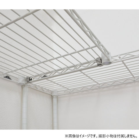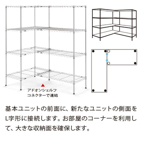 ワイヤーシェルフ同士の連結パーツ。直線タイプ、L字タイプ、どちらにも活用でき、ポールの節約にもつながります。コネクターを連結しても、ワイヤー1枚あたりの耐荷重は変更ありません。