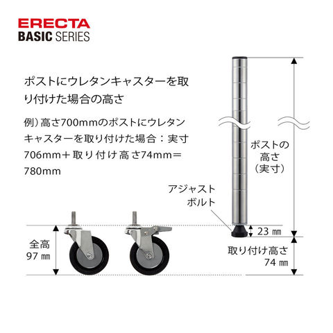 床にやさしく、移動もスムース。エラストマーの大きな車輪で、フローリングにキズがつきにくく静かでスムースな移動が出来ます。ポスト下部のアジャストボルトを外し、ねじ込むだけで取り付けも簡単。【仕様】総耐荷重:4個使用時/120kg(静止時)、80kg(可動時)●キャスター寸法:直径75mm・全高97mm・取り付け高さ74mm●エラストマーキャスターを使用した場合の最大外寸:間口・奥行寸法に104mmを足した寸法になります。●付属品: 平ワッシャー、スプリングワッシャー、専用スパナ●互換性:スーパーシリーズ、ファーストシリーズ等、他のシリーズとの互換性はありません。