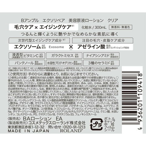 コスメテック、ローランド、B:ample、Bアンプル、エクソリペア、美容原液ローション、クリア、化粧水、保湿、ローション、スキンケア、お手入れ、肌、毛穴、皮脂、アゼライン酸、しっとり、なめらか、素肌、無香料、無着色