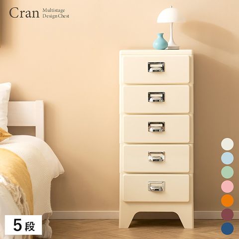 ツヤ感と丸みのあるデザインがレトロ可愛い多段チェスト『Cran(クラン)』。幅39.5cmのスリムサイズでどんな場所にも置けます。段数は2・3・5段の3タイプあり収納したい物に合わせてお選びいただけます。クリーム、ライトブルー、ライトグリーン、ピンク、オレンジ、ワイン、ネイビーの7カラー展開。お部屋のアクセントにもなります。製品重量:10.4kg