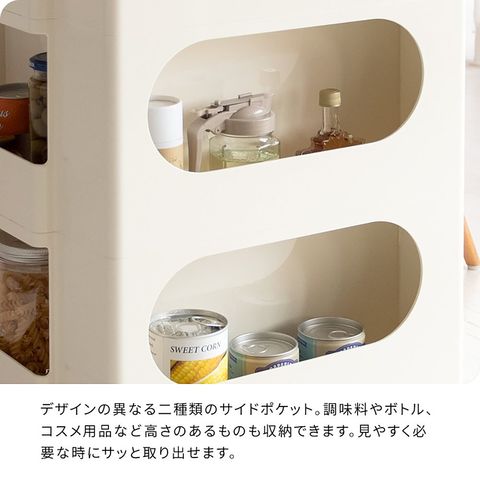 商品説明四面全てに収納スペースがある便利なトローリーワゴン『Pluna(プルーナ)』。丸みのある可愛いデザインが目を惹きます。180度回転するスライドトレイやポケット収納など、4種類の収納スペースがあり、リビングや寝室、デスクなど色々なシーンでマルチにお使いいただけます。ベビー用品の収納にもオススメ。5輪キャスターでラクラク移動できます。製品重量:8.5kg 完成品(キャスターのみ取り付け)