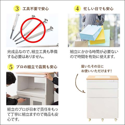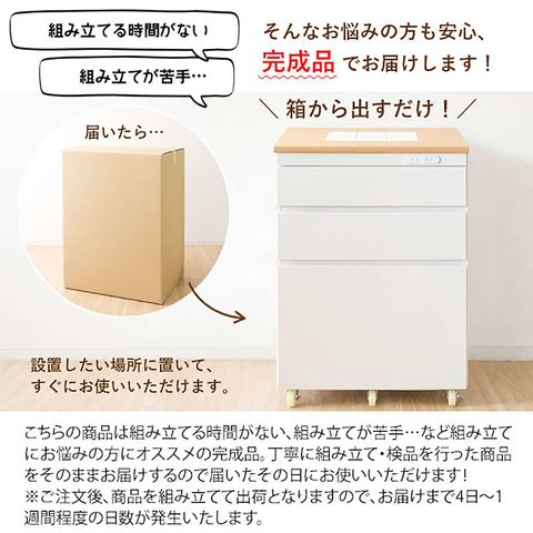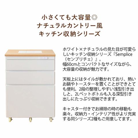 商品説明ホワイト×ナチュラルの見た目が可愛らしいキッチン収納シリーズ『Semplice(センプリチェ)』。 幅60cmとコンパクトなサイズながら、大容量の収納が魅力です。 天板上にはタイルが敷かれており、熱いお鍋やトースターを置くことができとても便利。2段の整理しやすい浅型引き出しと、2Lペットボトルも入る深型引き出しにたっぷり収納できます。 キャスター付きでお掃除の時の移動も楽々。 収納力・インテリア性がより充実する同シリーズ2種もご用意しております。