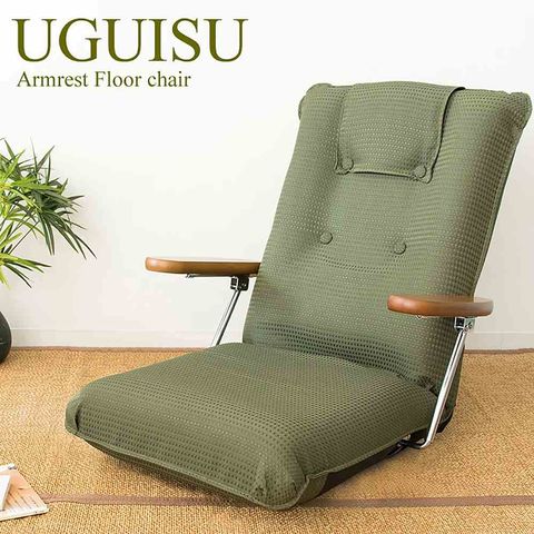 簡単に跳ね上がるポンプ式の肘置きがついた、落ち着きのあるベーシックな日本製座椅子『UGUISU(うぐいす)』。 特製のオリジナルの肘金具を使用しているのでとても丈夫で、立ち座りに便利です。 レバー式13段階リクライニングでテレビ鑑賞や読書、お昼寝など快適にお使いいただけます。 カラーはグリーンとブラウンの2カラーをご用意。お家の雰囲気やお好みでお選びください。