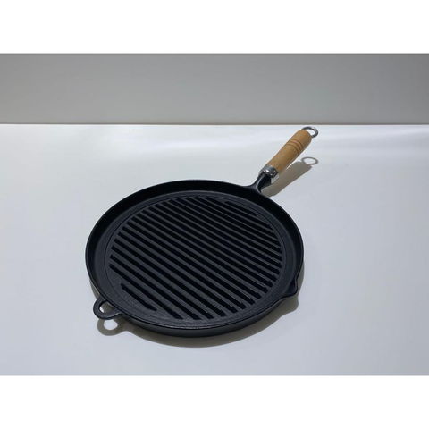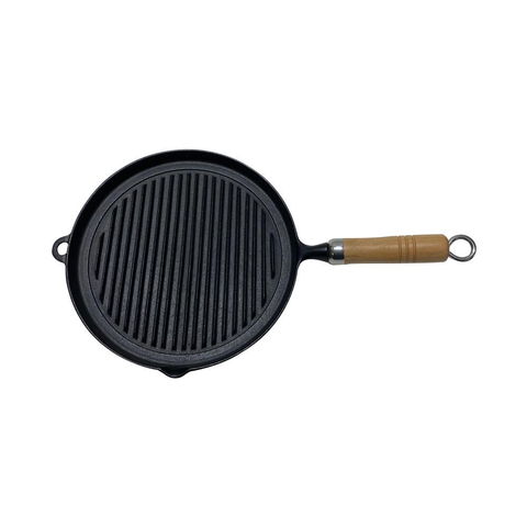 鋳肌が美しい岩鋳のキッチンウェア 余分な油が落ちてヘルシー。焼き目も美しい。木柄付きなので持ち手が熱くなりません。仕様:熱源:ガス・直火・IH等使用可