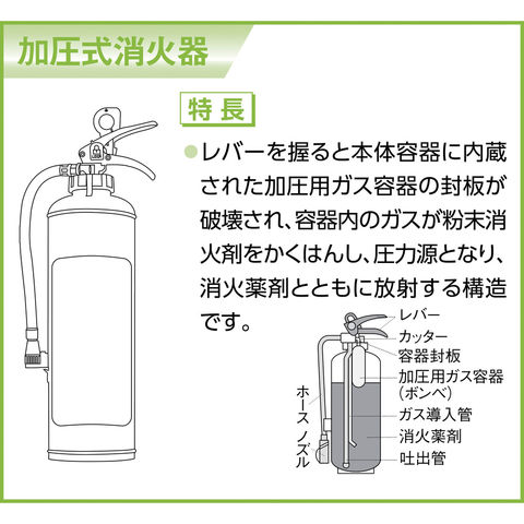 商品説明●環境に優しいエコ消火器です。●放射時間(秒):約15●放射距離(m):3~6●薬剤量(kg):3●高さ(mm):472●設計標準使用期限:10年●18500.0●ガス加圧式 質量4.9kg