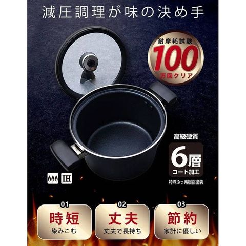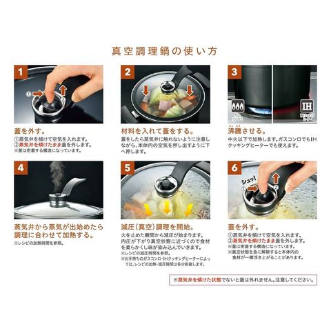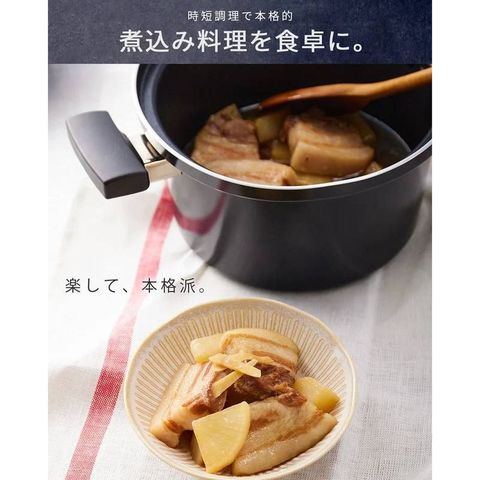 安心・安全・簡単・省エネ「真空煮込み鍋」「真空煮込み鍋」なら、ひと晩寝かせたあのおいしさが簡単に。【安心・安全】減圧(真空)のため吹き出す危険もなく、蒸気弁とロックをしない蓋の構造でさらに安全。ガラス蓋だから中身が確認できて安心です。【とっても簡単】お鍋に具材と調味料を入れて加熱し、後は火を止めて放っておくだけ。誰でも簡単に使えます。付属のレシピで、真空煮込み料理も簡単に!【味の染み込み良好】減圧による真空効果で味がじっくり染み込みます。さらに密着蓋で少量の水分や油での調理が可能。栄養分の流出を最小限に抑え、旨みを逃しません。【お得でエコ】加熱時間が短い真空煮込みが可能だから、光熱費の節約、CO2の排出を抑えます。地球と人とお財布にとっても優しいお鍋です。【仕様】[寸法]19cm[満水容量]3.3L