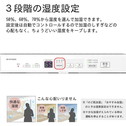 商品説明●目に見えない細かな水粒子で、空間を隅々まで加湿します。●気化式と温風気化式のハイブリッド式なので、乾燥している時は素早く加湿し、湿度が安定すると運転を抑え経済的な運転を行います。●50~70%の10%単位でお好みの湿度を設定できます。●湿度センサーにより、設定した湿度を保つように自動で運転状態をコントロールします。●カンタン取替えトレイカバーをセットして使用することで、トレイの洗浄が不要となります。●電源(V):単相100●加湿能力(L/h):1500●消費電力(W)(50/60Hz):380/380●タンク容量(L):12.0●色:ホワイト●幅(mm):450●奥行(mm):348●高さ(mm):410●電源コード長さ(m):2.0●加湿能力(ml/h):1500●連続加湿時間(h):8.0●加湿方式:気化ハイブリッド式●運転モード:標準/静音/eco/のど・肌●湿度設定:50%/60%/70%●現在湿度表示:デジタル表示●湿度センサー搭載●入切タイマー:2時間/4時間/6時間/8時間●半透明白色タンク●チャイルドロック●カンタン取替えトレイカバー 質量9.4kg