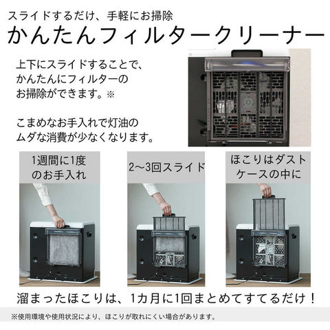 商品説明●スピード着火とオートターボ運転で、冷えたお部屋を素早く暖めます。●消火時のニオイが更に少なくなった秒速消臭システムプレミアム搭載でより快適にご使用頂けます。●ecoおまかせモードプラスは、室温の変化に合わせて燃焼を自動コントロールし、無駄な灯油の消費を抑えます。●大容量9Lタンクで給油の回数を大幅に低減できます。●灯油の残量がひと目で確認できる8段階油量計モニターを搭載しています。●かんたんフィルタークリーナーで、お手入れの手間を軽減します。●電源(V):単相100●暖房出力(kW):3.70~0.74●タンク容量(L):9.0●本体寸法(mm)幅:438●本体寸法(mm)奥行:385●本体寸法(mm)高さ:445●電源コード長さ(m):1.8●色:スノーホワイト●暖房目安コンクリート:13畳●暖房目安木造:10畳●燃料消費量(L/h):0.360~0.072●燃焼持続時間(h):25.0~125.0●秒速消臭システムプレミアム●オートターボ運転●ecoおまかせモードプラス●35秒スピード着火●ワンタッチ汚れんキャップ●オレンジ液晶●大容量9Lタンク 質量12.2kg