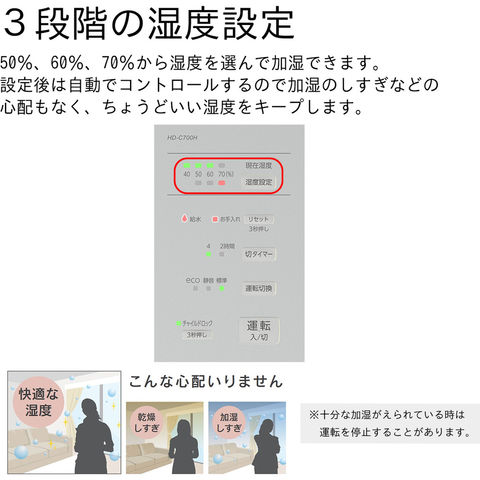 商品説明●目に見えない細かな水粒子で、空間を隅々まで加湿します。●気化式と温風気化式のハイブリッド式なので、乾燥している時は素早く加湿し、湿度が安定すると運転を抑え経済的な運転を行います。●50~70%の10%単位でお好みの湿度を設定できます。●湿度センサーにより、設定した湿度を保つように自動で運転状態をコントロールします。●eco運転で消費電力は14~18Wです。●電源(V):単相100●加湿能力(L/h):700●消費電力(W)(50/60Hz):285/285●タンク容量(L):4.7●色:マットグレー●幅(mm):375●奥行(mm):210●高さ(mm):375●電源コード長さ(m):2.0●加湿能力(ml/h):700●連続加湿時間(h):6.7●使用範囲目安:木造12畳、プレハブ19畳●標準消費電力料金(50Hz):8.8円/h●標準消費電力料金(60Hz):8.8円/h●加湿方式:気化ハイブリッド式●運転モード:標準/静音/eco●湿度設定:50%/60%/70%●現在湿度表示:LED表示●湿度センサー搭載●切タイマー:2時間/4時間●半透明白色タンク 質量5.1kg