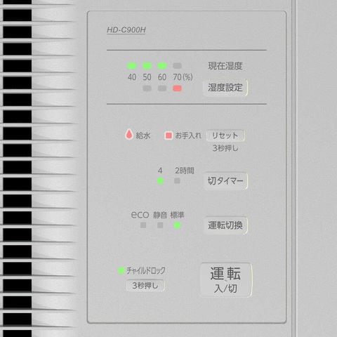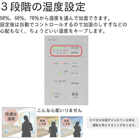 商品説明●目に見えない細かな水粒子で、空間を隅々まで加湿します。●気化式と温風気化式のハイブリッド式なので、乾燥している時は素早く加湿し、湿度が安定すると運転を抑え経済的な運転を行います。●50~70%の10%単位でお好みの湿度を設定できます。●湿度センサーにより、設定した湿度を保つように自動で運転状態をコントロールします。●eco運転で消費電力は14~18Wです。●電源(V):単相100●加湿能力(L/h):860●消費電力(W)(50/60Hz):470/470●タンク容量(L):4.7●色:マットグレー●幅(mm):375●奥行(mm):210●高さ(mm):375●電源コード長さ(m):2.0●加湿能力(ml/h):860●連続加湿時間(h):5.5●使用範囲目安:木造14.5畳、プレハブ24畳●標準消費電力料金(50Hz):14.5円/h●標準消費電力料金(60Hz):14.5円/h●加湿方式:気化ハイブリッド式●運転モード:標準/静音/eco●湿度設定:50%/60%/70%●現在湿度表示:LED表示●湿度センサー搭載●切タイマー:2時間/4時間●半透明白色タンク 質量5.1kg