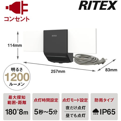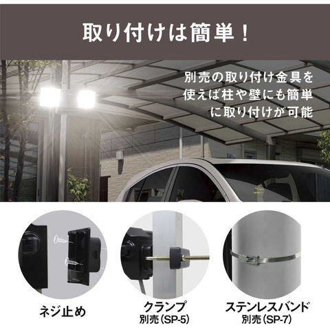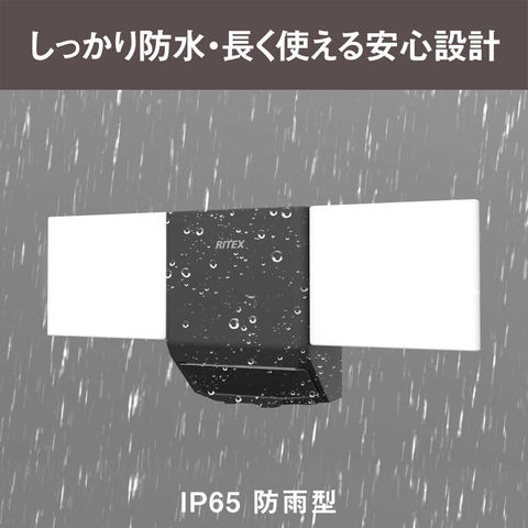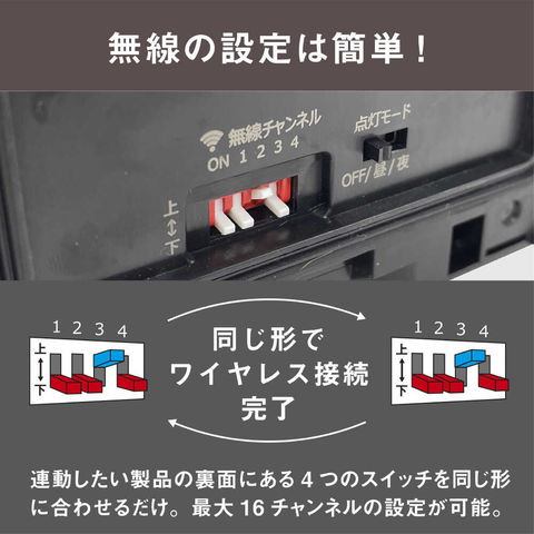商品説明●無線連動で一斉点灯します。●1か所のセンサーが感知すると設置しているライト複数台を一斉に点灯させることができます。●複数台設置することで、車を車庫に入れる時や帰宅時に広範囲が一気に明るくなります。●一斉点灯による威嚇効果と死角がなくなることで防犯効果を高めます。●ワイヤレスの連動設定は簡単シンプルです。●連動したい製品の4つのスイッチを同じ形に合わせるだけです。●設置しているすべてのワイヤレス製品を同じ形にすればすべての製品が一斉点灯します。●スイッチの形を分けることで連動グループを区別することも可能です。(最大16台16チャンネル)●幅(mm):257●奥行(mm):83●高さ(mm):114●光源色:白●使用電球(W):7●電球:7W×2 (高輝度白色LED設計寿命4万時間)●全光束:1200ルーメン / 常夜灯 約60ルーメン●電源/電圧:AC100V/50Hz/60Hz●消費電力:点灯時:15W(点灯時) / 1.5W (常夜灯) / 待機時:0.5W以下●センサー探知方式:焦電型赤外線センサー●探知範囲:最大180° 最遠8m 取り付け高さ2.5m 質量640g