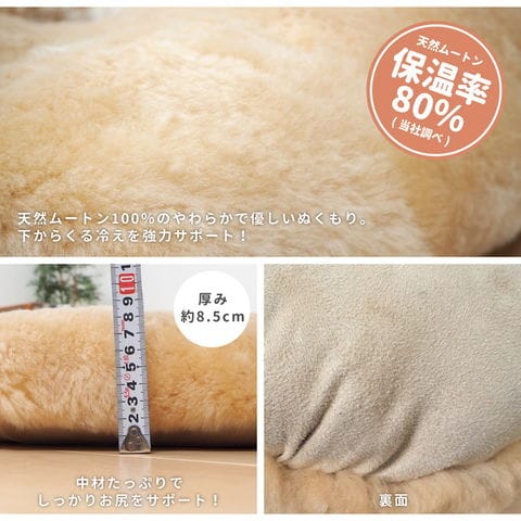 商品説明天然ムートンでぬくぬく円座クッション。羊毛皮100%のやわらかで優しいぬくもりは、特別な感触です。化学繊維とは違うあたたかさを是非ご実感ください。天然ムートンは、保温率80%(当社調べ)でぽかぽか。驚異の保温率で下からくる冷えを強力サポート。また。お尻への負担を軽減してくれるので、オフィスや車の運転など長時間座られる方にもおすすめです。
