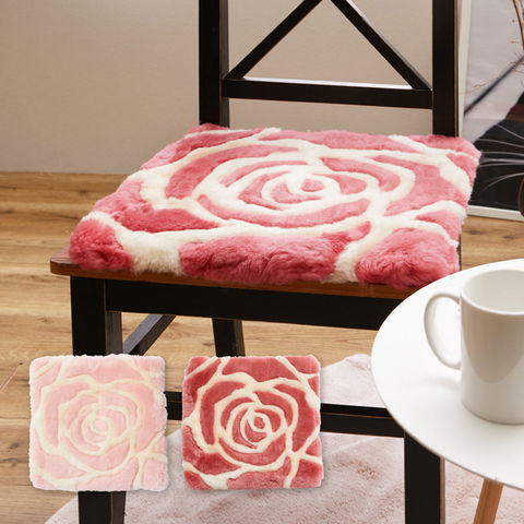 エレガントなローズデザインのシートクッション。天然素材のムートンは、吸水性、放湿性に優れ、火にも強く、燃え広がりにくい、まさに呼吸する素材。表面は水を弾く性質もあり、自然の効力をもった人にやさしい万能素材です。包み込まれるようにやわらかで、優しいぬくもりがあふれるタッチ感は、化学繊維とは異なる特別な感触です。中材にはウレタンフォームを使用しているのでクッション性があり、床やソファ、車のシートなど様々な場所で大活躍!