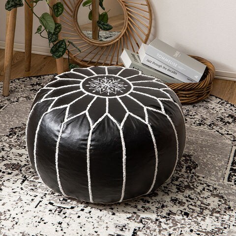 商品説明フェイクレザーにモロッカンデザインの刺繍を施したおしゃれなプフ。ころんとしたフォルムが特徴的なプフは、お部屋に置いておくだけでかわいいインテリアアイテムです。スツールとして座ったり、サイドテーブルや肘掛け、オットマンとしてなど使い方いろいろ。中材には発泡ビーズを使用しており、軽くて持ち運びやすいのもうれしいポイントです。底面にはビーズを補充できるファスナー付きで、中身がへたってきたら市販のビーズを追加することができます。