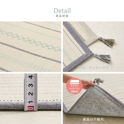 さらっとした踏み心地とインド綿ならではの素朴な仕上がりが魅力のラグ。四隅に付いたフサ(タッセル)でおしゃれ度アップ!吸湿発乾性が良く年中使えるタッチ感もインド綿の人気の秘密です。お客様のご要望に応えて、すべり止め付きを開発しました!