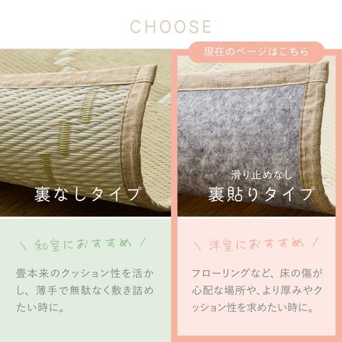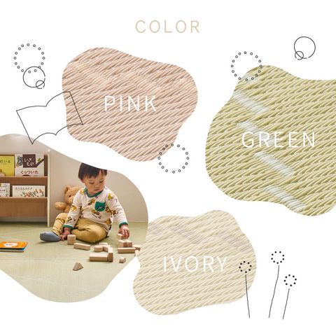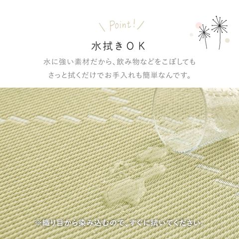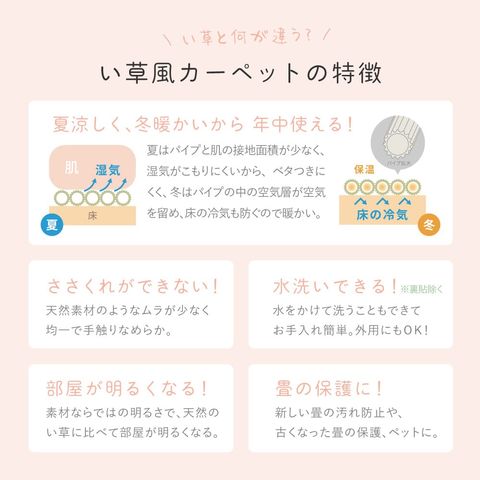 商品説明パステルカラーがかわいい、水に強い素材でできたい草風カーペット。地味な雰囲気になりがちな和室も明るくかわいいお部屋にイメージチェンジできます。傷んでしまった畳のカバーや、新しい畳の日焼けやキズの防止にも。パイプの表面に筋が入っている筋入りパイプで、肌に密着しないからベタベタしにくく、汗ばむ季節にもおすすめ。また、パイプ内の空気層の保温効果で床からの冷気を防ぐため、寒い季節でもあたたかく過ごせます。裏面は不織布貼りで、フローリングなど床への傷が心配な場所でも安心です。