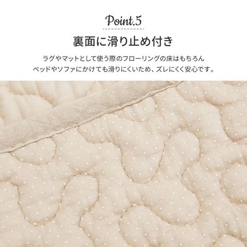 表面:綿100% 中綿:ポリエステル100% 裏面:ポリエステル100% すべり止めドット付き