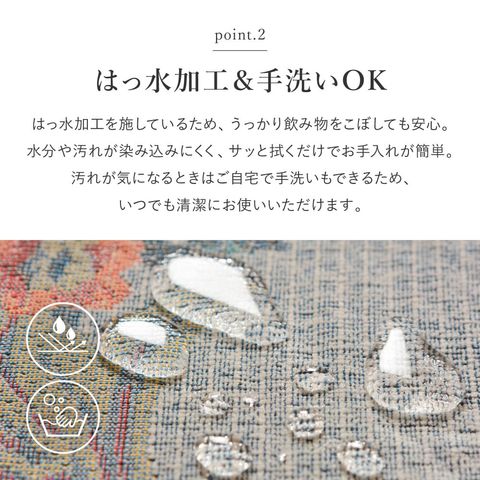 商品説明たくさんの花束モチーフが空間を上品に彩る、ゴブラン織りシェニールラグ。ビロードのような毛羽をもつシェニール糸を使用し、さらりとなめらかな肌触りで季節を問わず快適に使えます。はっ水加工により、飲み物をこぼしてもサッと拭き取りやすく、汚れが気になるときは手洗いも可能。約5mmのウレタン入り三層構造で、程よい厚みとクッション性があり、くつろぎ時間や家族団らんに心地よさをプラスします。裏面は滑り止め付きでズレにくく、ホットカーペット・床暖房にも対応。リビングやダイニングなど、日常使いしやすい一枚です。