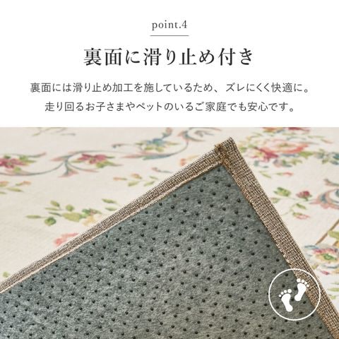 たくさんの花束モチーフが空間を上品に彩る、ゴブラン織りシェニールラグ。ビロードのような毛羽をもつシェニール糸を使用し、さらりとなめらかな肌触りで季節を問わず快適に使えます。はっ水加工により、飲み物をこぼしてもサッと拭き取りやすく、汚れが気になるときは手洗いも可能。約5mmのウレタン入り三層構造で、程よい厚みとクッション性があり、くつろぎ時間や家族団らんに心地よさをプラスします。裏面は滑り止め付きでズレにくく、ホットカーペット・床暖房にも対応。リビングやダイニングなど、日常使いしやすい一枚です。