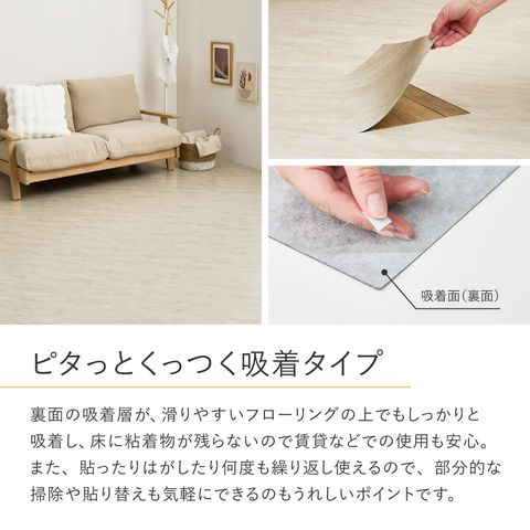 商品説明貼ってはがせて、何度も繰り返し使えるフロアタイル。フィルムをはがして、床の上から貼るだけでお部屋を簡単にイメージチェンジできます。超薄型&軽量なので施工も簡単!賃貸や新築の床への汚れや傷の防止にも。キッチンや洗面所など水周りにも使えて、粘着が落ちても水で洗えば繰り返しご使用いただけます。カッターで簡単にカットでき、お部屋に合わせて敷き詰められます。