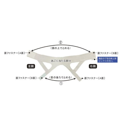 商品説明寝ているときじゃまにならない形状。あご関節の脱臼予防に。2点留めで「かんたん」。装着。面ファスナーで「しっかり」固定。綿が主体の「やさしい」素材。耳が出るように着けてください。※値がぎりぎりの場合は1サイズ下をおすすめします。装着方法:(1)あごに当たる部分をあごに当て、。装着位置を確認します。(2)面ファスナーの両端を持ち、首の後ろにまわし、首の後ろでとめます。((1))(右手側のが上になります)(3)面ファスナーの両端を持ち、あごにフィットするように頭の上でとめます。((2))(右手側の(B面)が上になります)(4)後ろから見た図固定力を微調整してください。