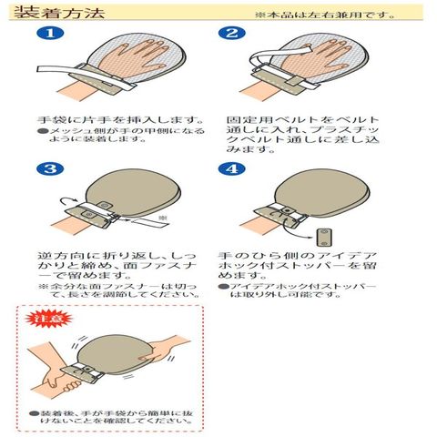 ご本人では開けにくいアイデアホックを採用。保護パッドにより,物がつかみにくい形状になっています。保護パッドは手袋の両面に入っているため,左右・裏表関係なく使用できます。手首ベルトの上からアイデアホック付あまぶた(取り外し可能)をかぶせて留めるため,使用者ご本人にはミトンを外しにくい構造になっています。手袋の中はゆったりしていて手の動きを妨げません。