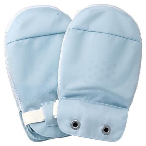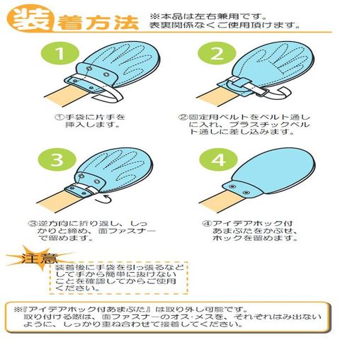 商品説明ご本人では開けにくいアイデアホックを採用。保護パッドにより,物がつかみにくい形状になっています。保護パッドは手袋の両面に入っているため,左右・裏表関係なく使用できます。手首ベルトの上からアイデアホック付あまぶた(取り外し可能)をかぶせて留めるため,使用者ご本人にはミトンを外しにくい構造になっています。手袋の中はゆったりしていて手の動きを妨げません。