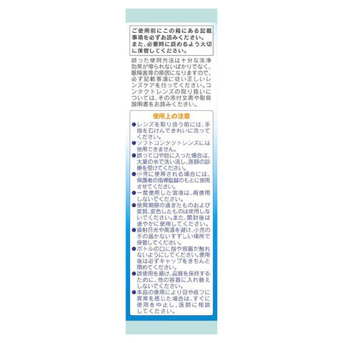 ソフトコンタクトレンズには使用できません。 誤って口や目に入った場合は、大量の水で洗い流し、医師の診療を受けてください。 小児に使用される場合には、保護者の指導監督のもとに使用させてください。 一度使用した溶液は、再使用しないでください。 使用期限の過ぎたものおよび変質、変色したものは使用しないでください。また、開封後は速やかに使用してください。 直射日光や高温を避け、小児の手の届かないすずしい場所で保管してください。 ボトルの口に指や他の容器が触れないようにしてください。使用後は必ずキャップをきちんと閉めてください。 誤使用を避け、品質を保持するために、他の容器に入れ替えしないでください。 本品の使用により目や皮フに異常を感じた場合は、すぐに使用を中止し、医師に相談してください。