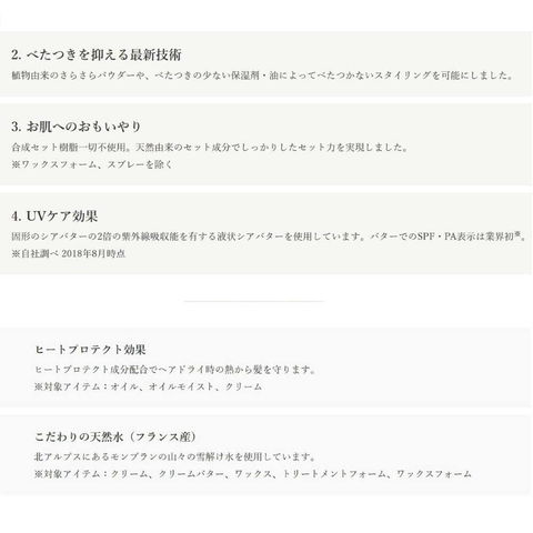植物由来のさらさらパウダーや、べたつきの少ない保湿剤・油によってべたつかないスタイリングを可能にしました。