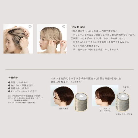 (使用方法)1. 指の間までしっかりのばし、内側や襟足などボリュームを抑えたい部分にしっかり髪の内側からつけます。2. 表面はつけすぎないよう、手に余った分を使います。毛先から5センチくらいまでの部分を指でつまみながらつけて毛流れを整えます。手に残った分はそのまま指になじませます。