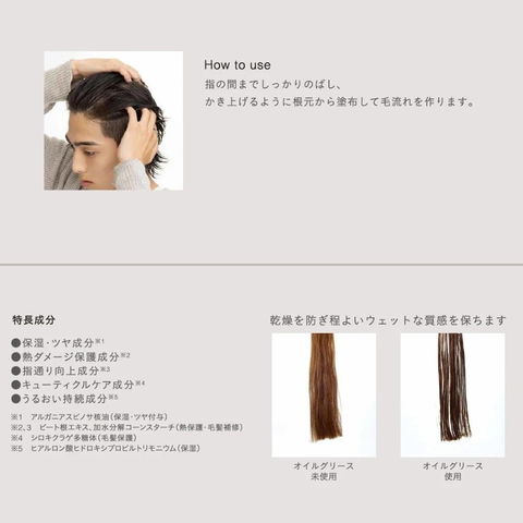 タイトなスタイルから動きのあるスタイルまで 幅広く表現するオイルグリース。