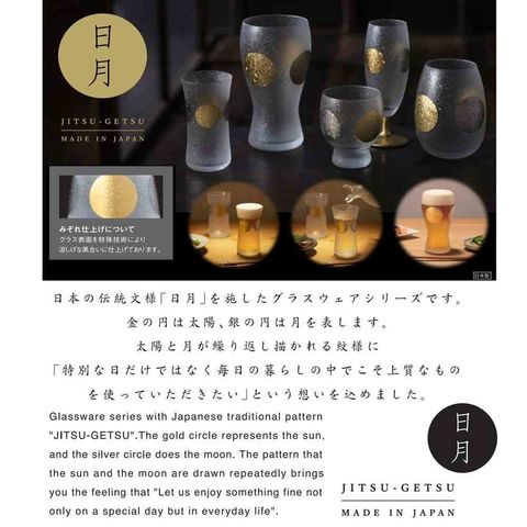 日本の伝統紋様「日月」を施したグラスウェアシリーズです。金の円は太陽、銀の円は月を表します。太陽と月が繰り返し描かれる紋様に「特別な日だけではなく毎日の暮らしの中でこそ上質なものを使っていただきたい」という想いを込めました。「みぞれ仕上げ」によりグラス表面を特殊技術にて涼しげな風合いに仕上げております。